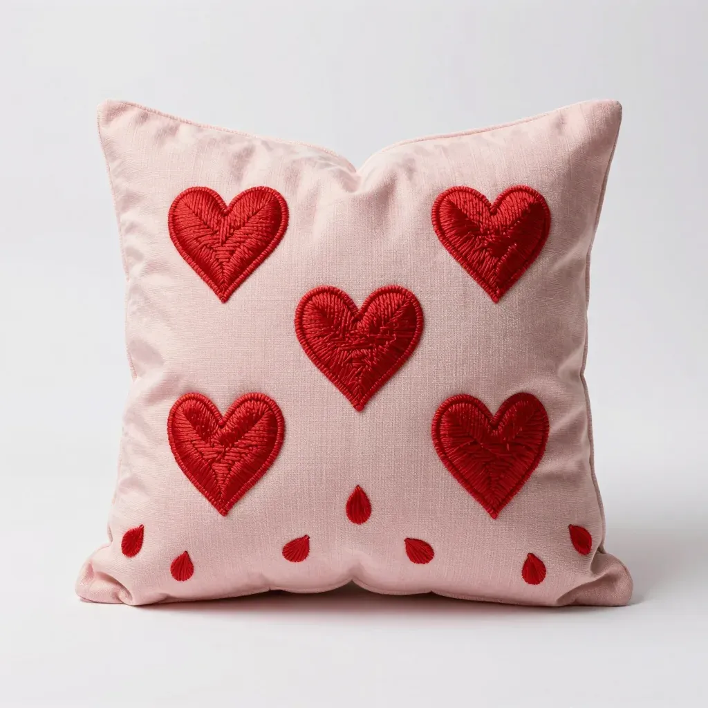 A soft, velvety pink throw pillow adorned with red embroidered hearts, illuminated by diffused ambient light that highlights the texture and depth of the embroidery. The plain white background ensures the pillow is the focal point, providing ample copy space for design integration.