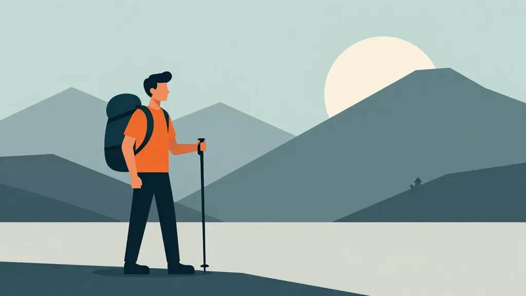 A hiker in an orange shirt pauses on a cliffside, surrounded by rugged terrain and a soft, diffused light from the setting sun. The composition emphasizes depth with the hiker in the foreground and distant mountains in the background, creating a serene and contemplative atmosphere.