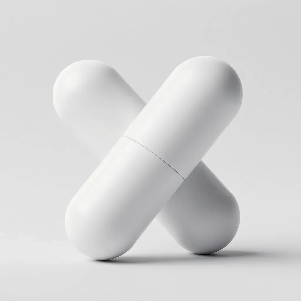 Two glossy white capsules form an 'X' shape, creating a balanced and symmetrical composition under soft, diffused lighting. The plain light gray background enhances the subject's clean and minimalistic aesthetic.
