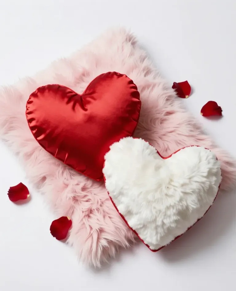 Two heart-shaped cushions, one glossy red and the other soft white, rest on a fluffy pink cushion, surrounded by delicate rose petals. The soft, diffused lighting highlights the textures and creates gentle shadows, enhancing the romantic and elegant mood of the scene.