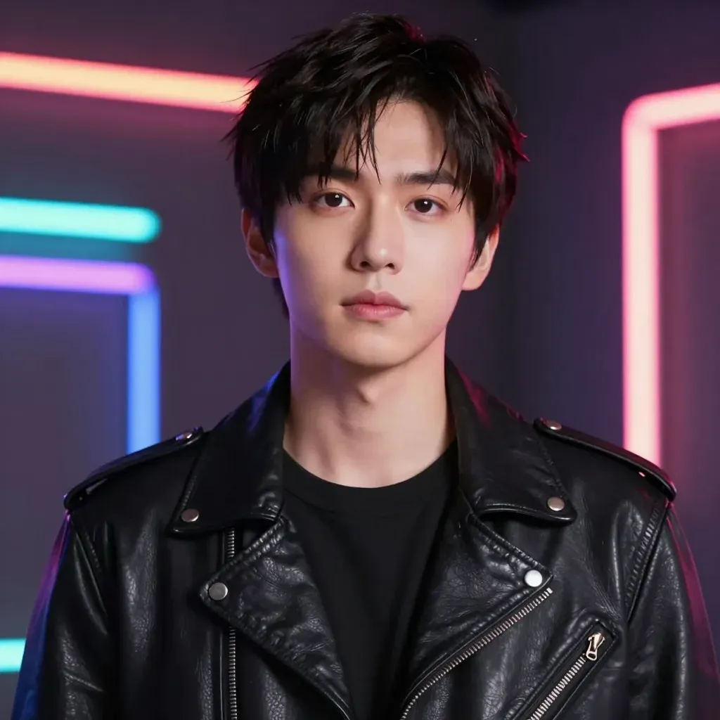 A young individual stands confidently in a black leather jacket, illuminated by soft neon lights that cast a vibrant glow on their face and jacket. The composition is centered, with the neon lights framing the background, creating a striking contrast and depth of field.