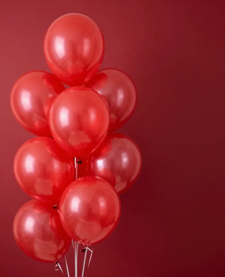 A cluster of glossy red balloons softly illuminated, creating a vibrant and festive scene. The deep maroon background enhances the rich red tones, providing a rich contrast and depth to the composition.