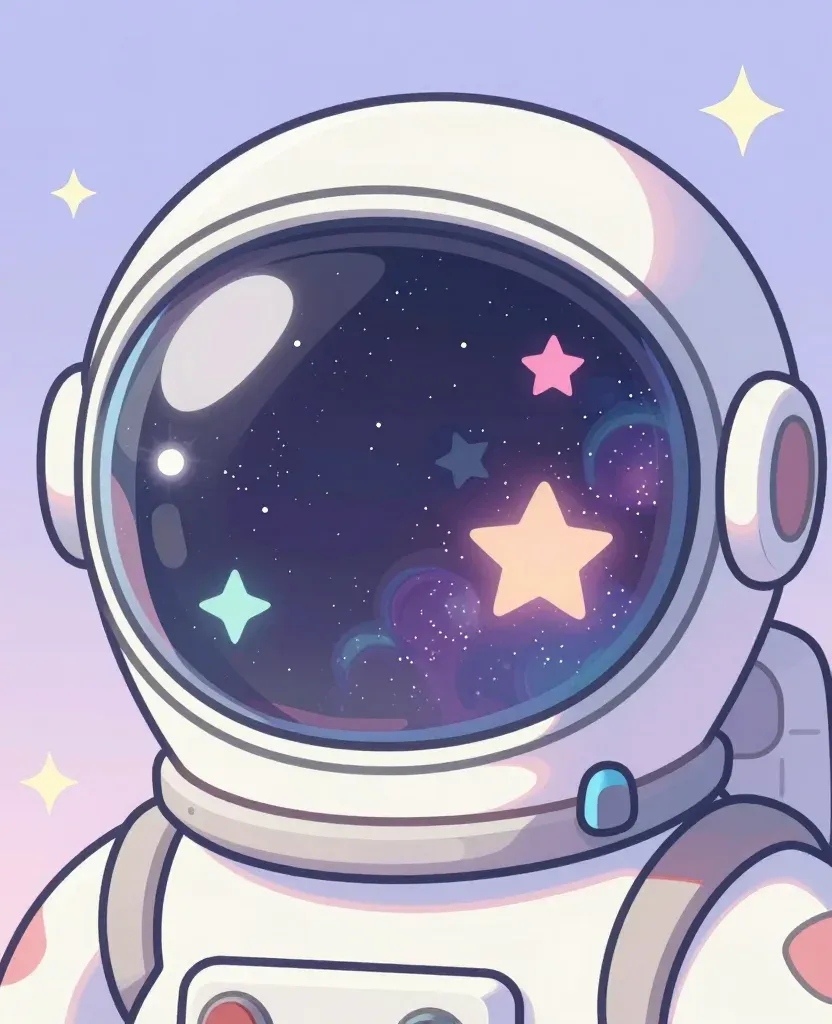 A soft, plush astronaut in a glossy space helmet gazes at a starry night sky, illuminated by diffused, gentle light. The dreamy, cosmic atmosphere is enhanced by a pastel gradient background with subtle star patterns, offering ample copy space for design elements.