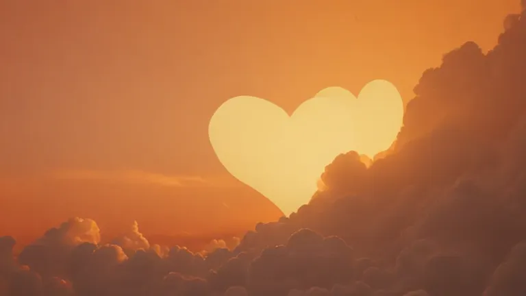 A heart-shaped silhouette of the sun glows warmly against a sky filled with fluffy, cotton-like clouds. The soft, diffuse lighting creates a serene and romantic atmosphere, ideal for backgrounds or as a focal point in design compositions.
