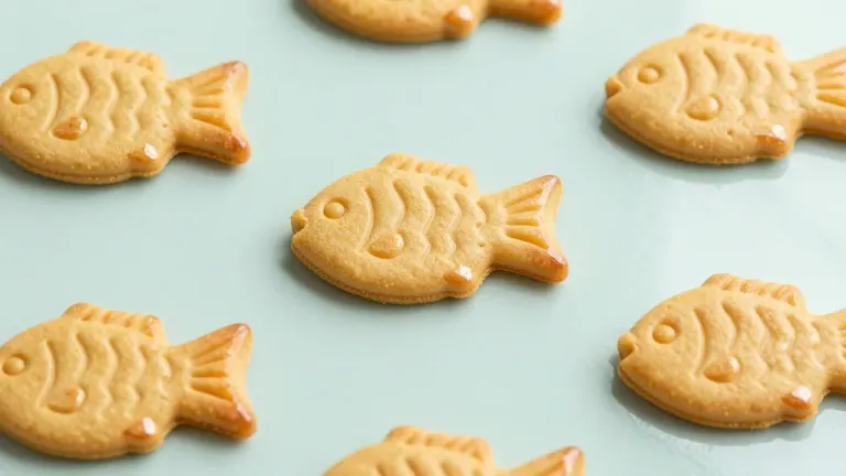 Golden fish-shaped crackers with a glossy, slightly rough texture, softly lit to highlight their shape and details. The clean, light blue background provides a simple and elegant backdrop, emphasizing the crackers' design and texture.