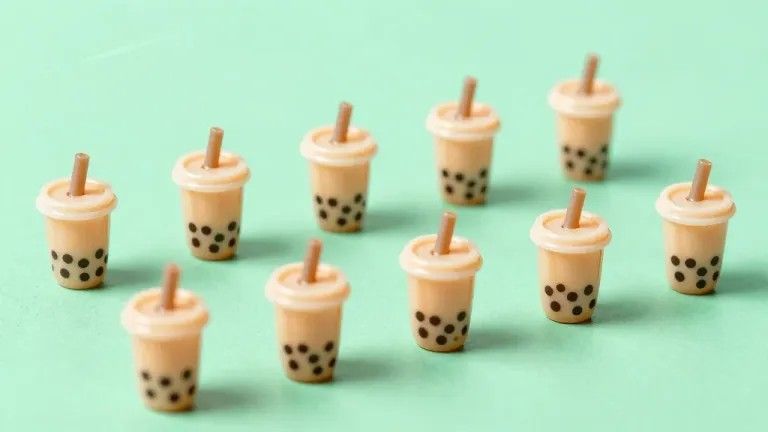 Smooth glossy plastic cups filled with creamy beige liquid and dark tapioca pearls, each topped with a matte wooden straw, arranged in a scattered formation. Soft front-top lighting creates gentle highlights on the rims and liquid surface, with shallow depth of field and ample negative space enhancing the playful composition.