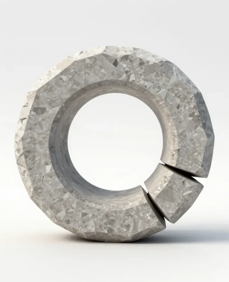 A broken stone ring with a textured surface stands upright, showcasing intricate facets and a soft, diffused light filtering through the gaps. The plain white background emphasizes the subject and its detailed texture.