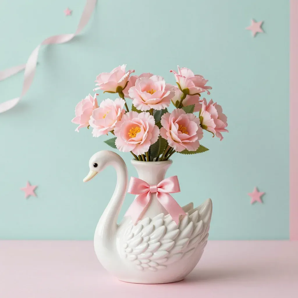 A glossy white ceramic swan vase holds a bouquet of soft, ruffled pink flowers, illuminated by diffused light that creates gentle shadows and highlights. The whimsical background of a light teal wall with scattered pink star cutouts adds a playful touch, making the image ideal for decorative and product photography.
