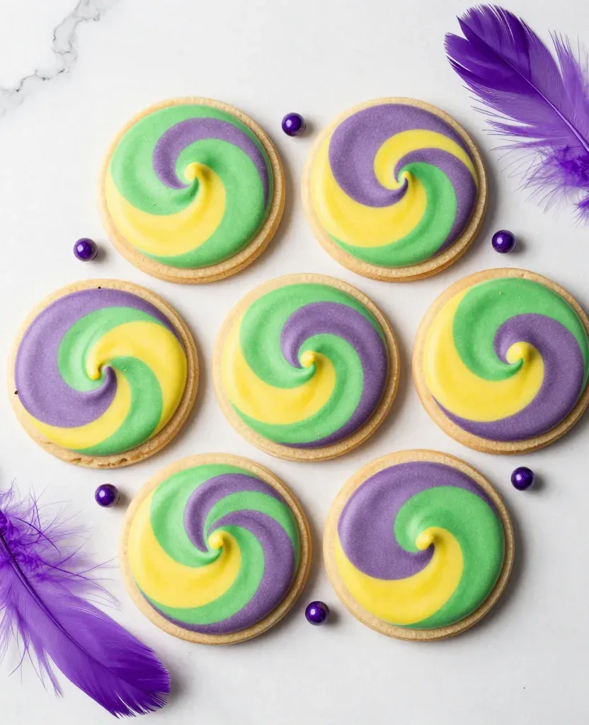 A symmetrical arrangement of frosted sugar cookies with vibrant Mardi Gras swirls, set against a clean white marble background, softly lit from above to create gentle shadows, emphasizing the cookies' glossy texture and crisp crust.