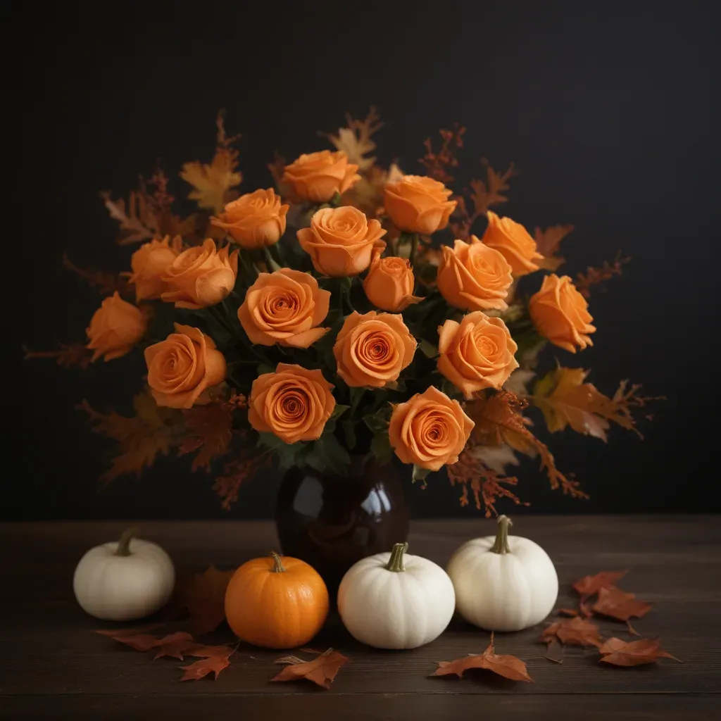 A bouquet of glossy orange roses and crisp autumn leaves, complemented by small white pumpkins, arranged in a dark vase with soft diffused lighting creating gentle shadows and highlights. The dark background ensures the subject stands out, providing ample copy space for text or design elements.