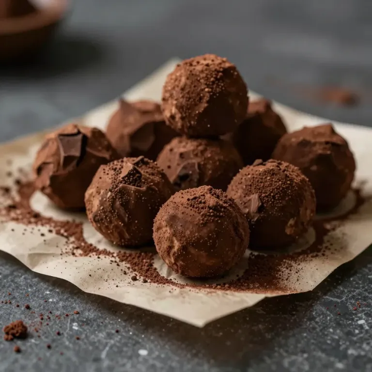 A casual pile of smooth, glossy chocolate truffles with a soft, creamy interior, dusted with cocoa powder, sits on parchment paper under soft, diffused lighting that creates gentle highlights and shadows, enhancing the truffles' texture and abundance. The blurred dark background helps the truffles stand out and adds depth to the image, making it ideal for culinary and food photography.