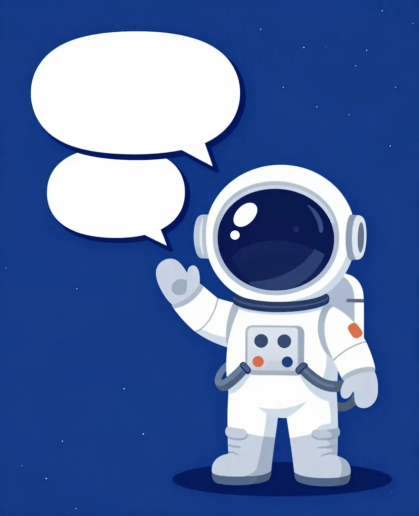 A cartoon-style astronaut in a white spacesuit waves with one hand, helmet visor dark and reflective, against a star-speckled navy blue background. Soft diffused lighting from above creates gentle highlights on the helmet rim and suit seams, with a centered medium shot composition and ample copy space around the speech bubbles.