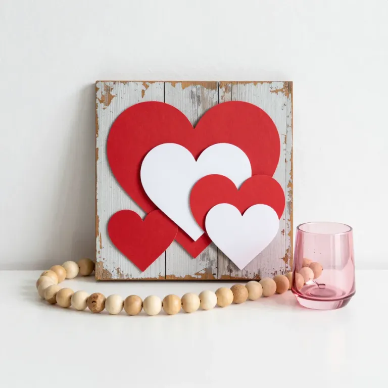 A rustic wooden board adorned with glossy red and white layered hearts, softly lit to highlight their glossy texture and casting gentle shadows, creating a clean and balanced composition against a stark white background.