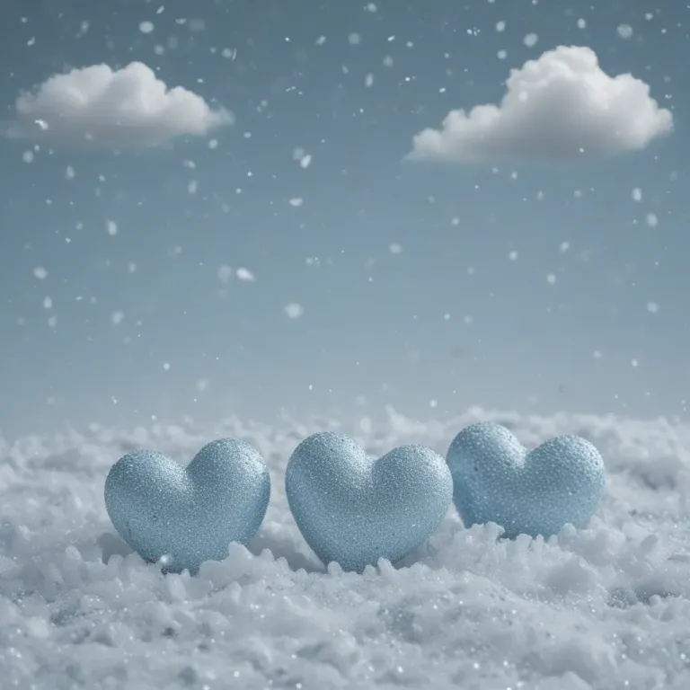 Three frosty, glistening heart-shaped objects rest on a snow-covered ground, illuminated by soft, diffused light from the sky, creating a serene and ethereal atmosphere. The slightly out-of-focus background of snow and sky emphasizes the hearts, providing a clean and minimalistic composition.