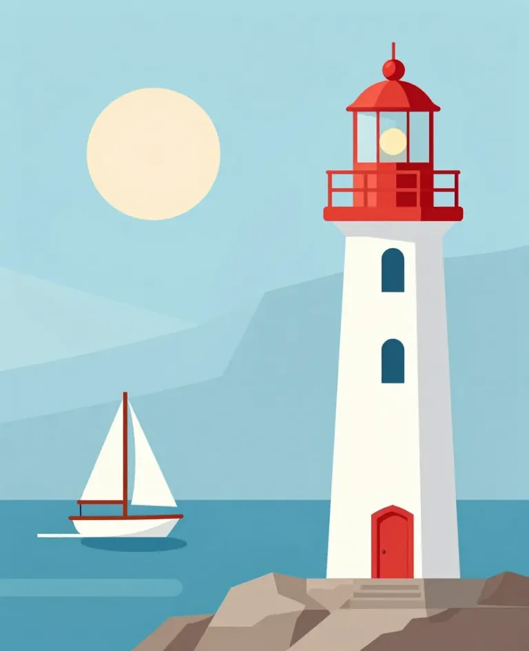 A glossy white lighthouse stands in the foreground, casting a soft glow on the calm sea, while a rough wooden sailboat glides in the middle ground, under the gentle light of a full moon. The hazy mountains in the background add depth and tranquility to the scene.
