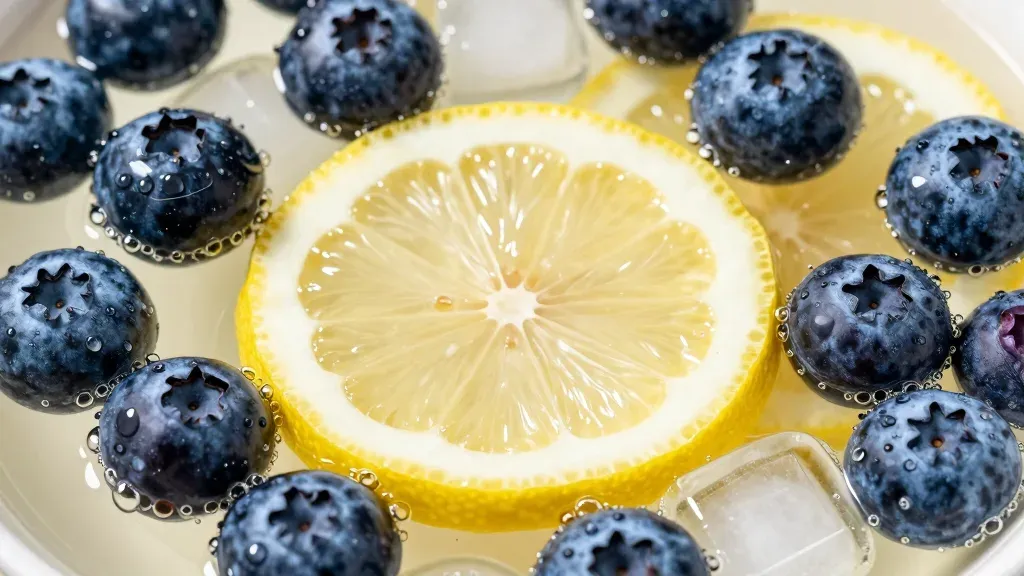 Juicy blueberries and a translucent lemon slice rest on ice cubes, illuminated by soft, diffused light that highlights their textures and vibrant colors. The shallow depth of field draws attention to the main subjects, creating a clean and focused composition.