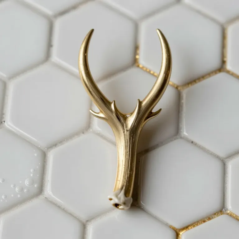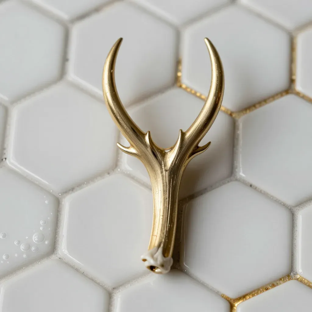 A lustrous gold antler brooch with intricate, smooth curves gleams under natural, warm, directional lighting, highlighting its reflective surface against a slightly blurred background of glossy white hexagonal tiles. The shallow depth of field draws attention to the brooch, creating a clean and elegant composition.