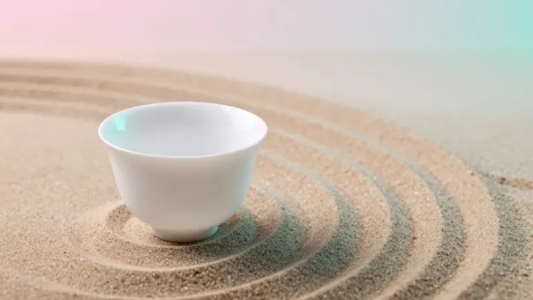 A white ceramic teacup with a glossy finish rests in a shallow, concentric sand garden, bathed in soft, pastel lighting that highlights its smooth texture and creates gentle shadows. The blurred background and shallow depth of field emphasize the teacup and the intricate sand patterns, offering a serene and minimalist aesthetic.