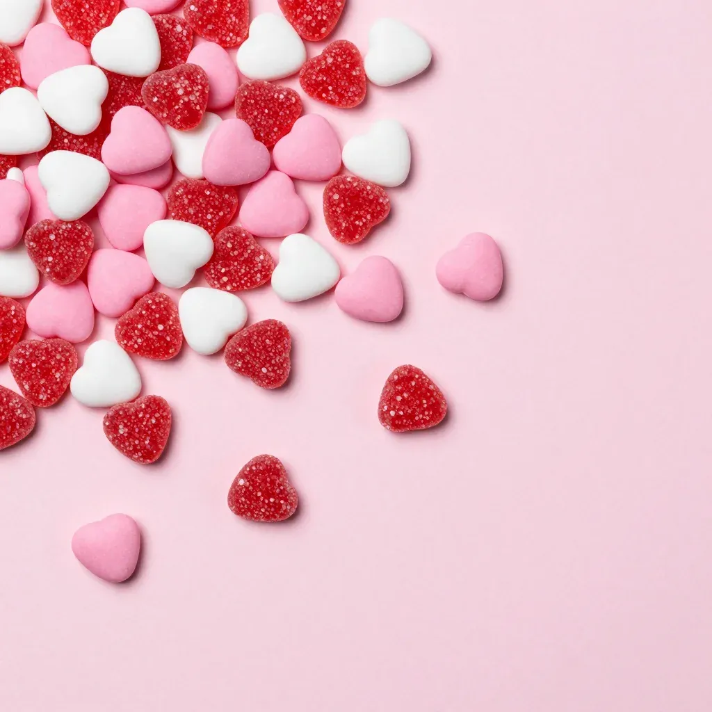 A pile of heart-shaped candies in red, pink, and white is scattered diagonally across a soft pink surface, with red hearts featuring a fine glitter texture and others appearing smooth and matte. Soft, diffused overhead lighting creates subtle highlights and gentle shadows, while shallow depth of field emphasizes foreground candies and leaves ample negative space on the right for design integration.