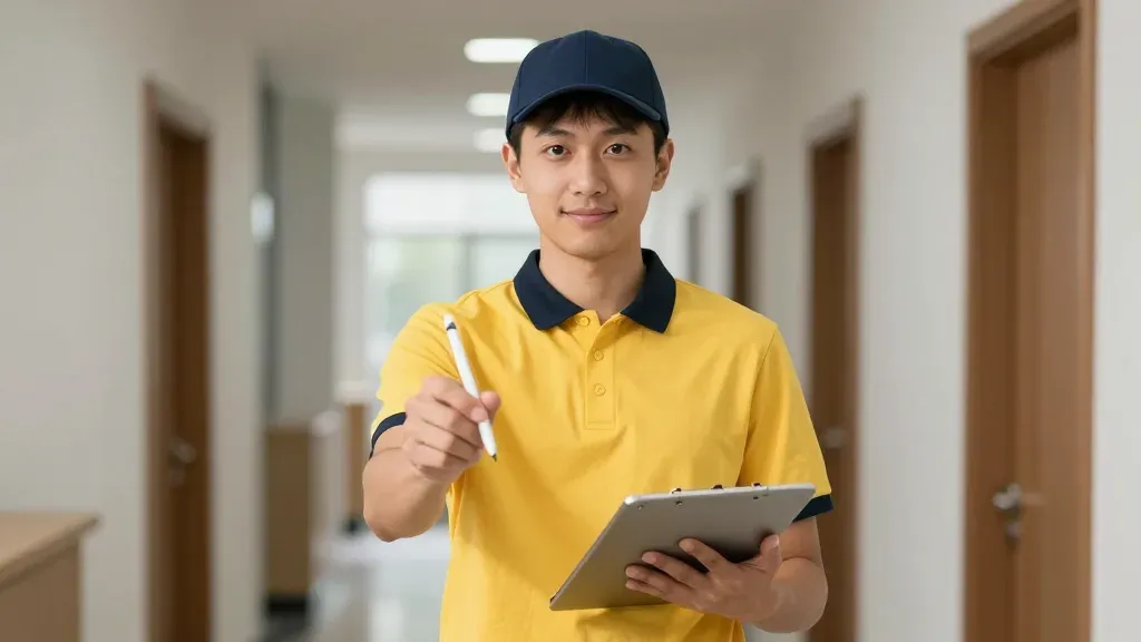 A delivery person in a yellow uniform signs a document on a glossy tablet in a clean, modern hallway. The soft, even lighting highlights the subject and creates gentle shadows, emphasizing the clean background and the subject's action.
