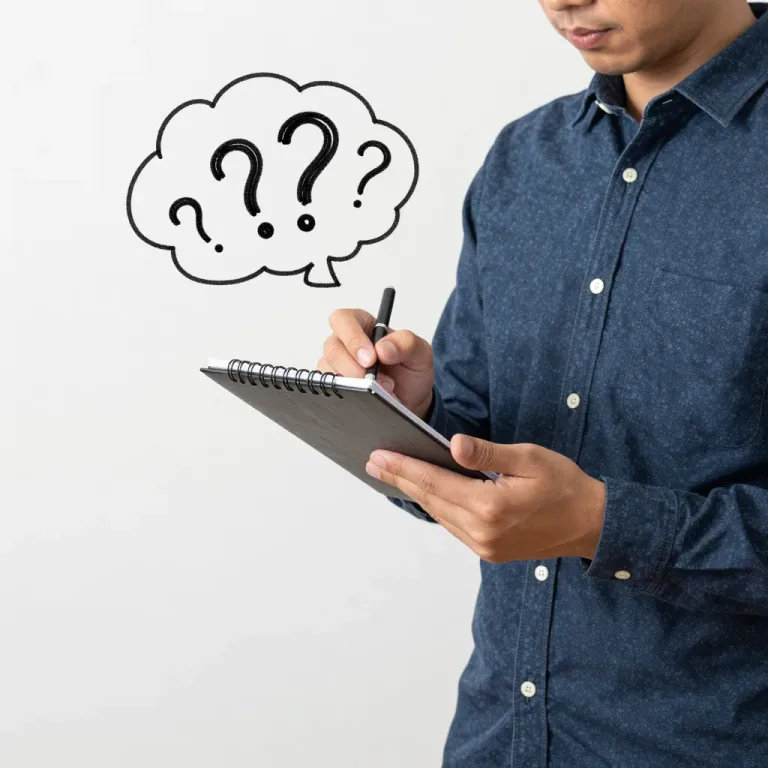 A man in a dotted blue shirt is writing in a notebook, with a thought bubble above his head containing question marks, suggesting contemplation or confusion. The soft, even lighting and plain white background keep the focus on the subject and his reflective action.