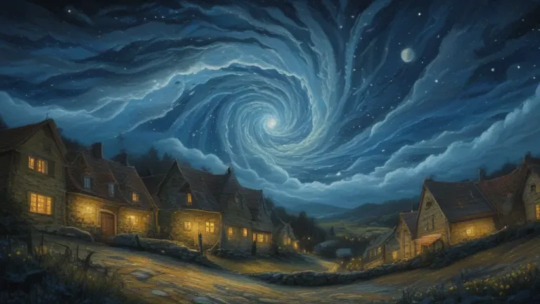 A quaint village with stone houses and thatched roofs bathed in warm, glowing light, set against a swirling star-studded sky. The soft, ambient light and balanced composition create a serene, almost magical atmosphere.