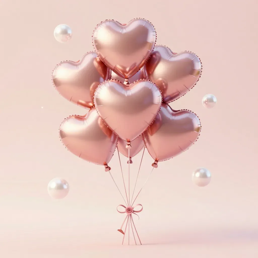 A cluster of heart-shaped balloons in a glossy rose gold finish, softly illuminated by diffused light, creating a romantic and elegant atmosphere. The blurred pastel pink background enhances the focus on the balloons, providing ample copy space for design elements.