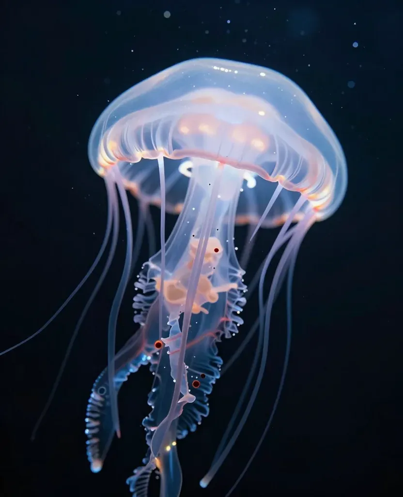 A jellyfish with a glowing bell and translucent, delicate tentacles bathed in soft, ambient light, creating a mesmerizing effect. The shallow depth of field and dark background emphasize the jellyfish, making it stand out vividly.