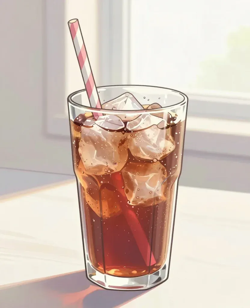 A tall glass of iced cherry soda with ice cubes and a striped straw, illuminated by soft natural light from a window, creating highlights on the ice and glass. The composition is centered on the glass, with a blurred background that emphasizes the drink and provides a sense of depth.