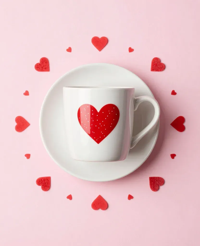 A white ceramic mug adorned with a red heart design rests on a matching saucer, surrounded by floating red hearts against a soft pink backdrop. The scene is illuminated by diffused overhead lighting, creating subtle highlights on the glossy ceramic surface and a shallow depth of field that emphasizes the mug and nearby hearts.