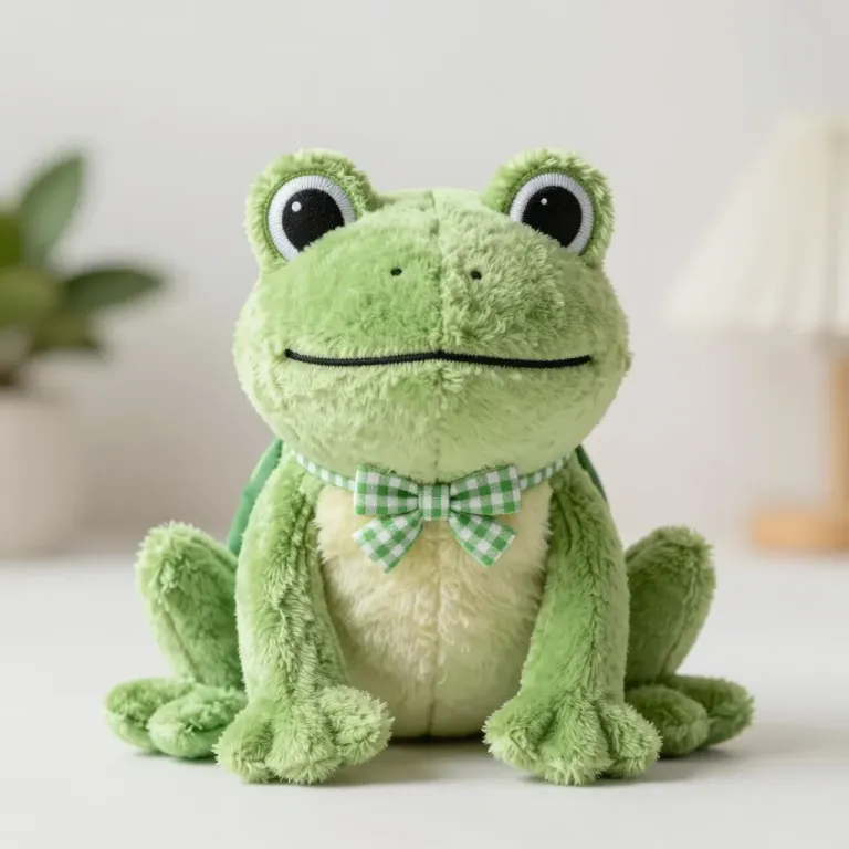 A soft, fuzzy green plush frog toy with a checkered bow sits on a smooth white stone surface, bathed in diffused, warm light that creates soft shadows and highlights. The blurred background of green foliage and a warm-toned lamp adds depth and context to the image.