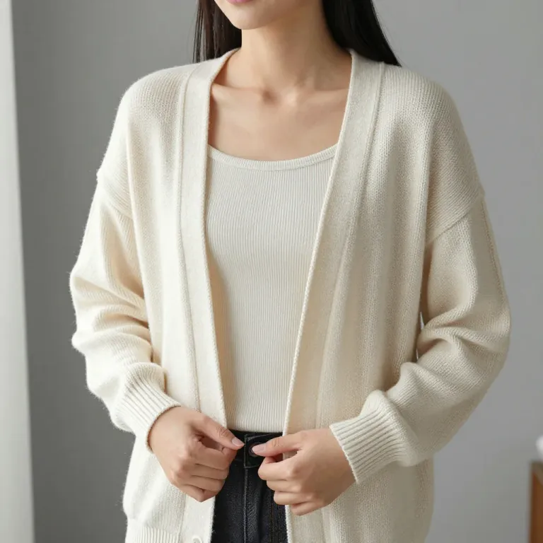 A woman adjusts a cream-colored cardigan over a ribbed inner top, with soft, diffused lighting highlighting the cardigan's folds. The neutral, blurred background emphasizes the subject and creates a clean, focused composition.