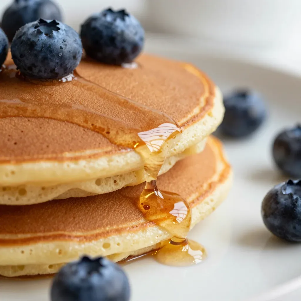 Three fluffy pancakes are stacked and garnished with fresh blueberries and a drizzle of amber syrup, showcasing soft porous textures and glossy highlights. Soft diffused lighting from the upper left enhances the syrup's viscosity and creates a shallow depth of field that isolates the stack against a clean, out-of-focus white plate.