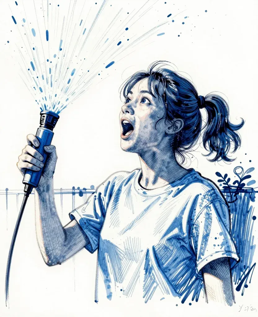 A young woman, soaked from head to toe, holds a garden hose, her face and hair glistening with water droplets. The cool blue light highlights the water spray and her expression, creating a dynamic and refreshing scene.