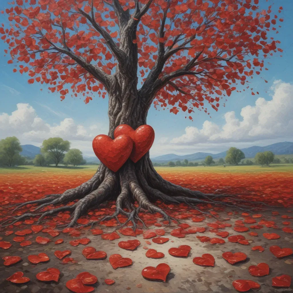 A tree adorned with heart-shaped objects and red petals, bathed in warm, setting sun light, creating a visually striking and emotionally evocative scene. The soft focus on the background emphasizes the foreground, making it ideal for romantic or nature-themed designs.