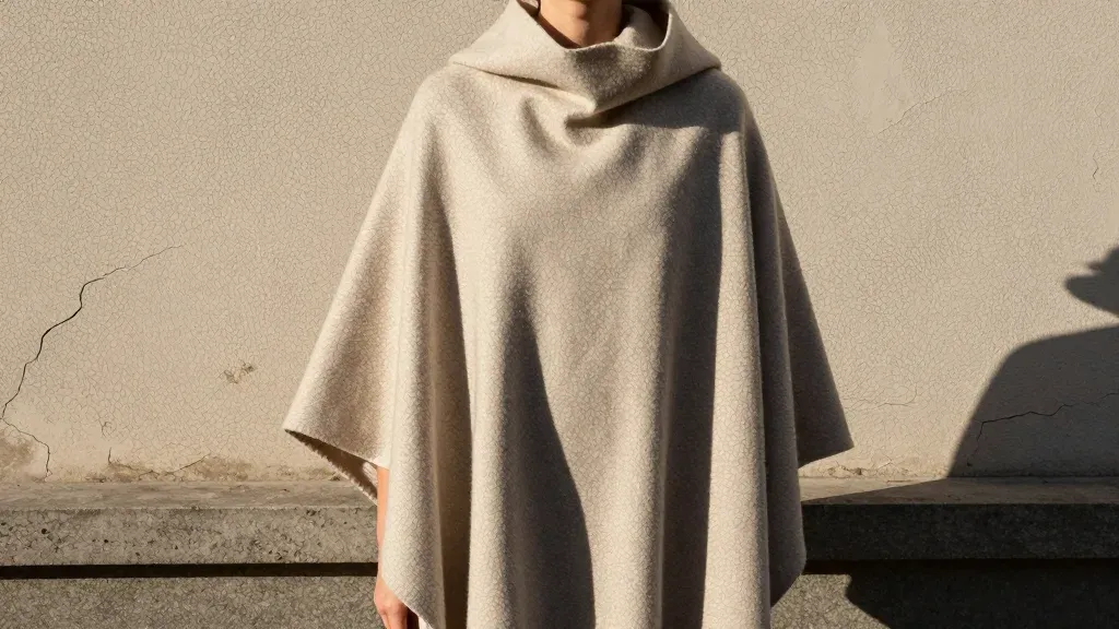 A person in a beige poncho stands against a cracked, textured wall, bathed in direct sunlight that highlights the rough textures. The centered composition and sharp shadows create a balanced yet dynamic feel, emphasizing the subject's silhouette and the wall's intricate details.