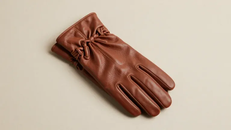 A pair of rich brown leather gloves is softly lit, highlighting their supple texture and subtle folds. The neutral, light beige background keeps the focus on the gloves, creating a clean and elegant composition.