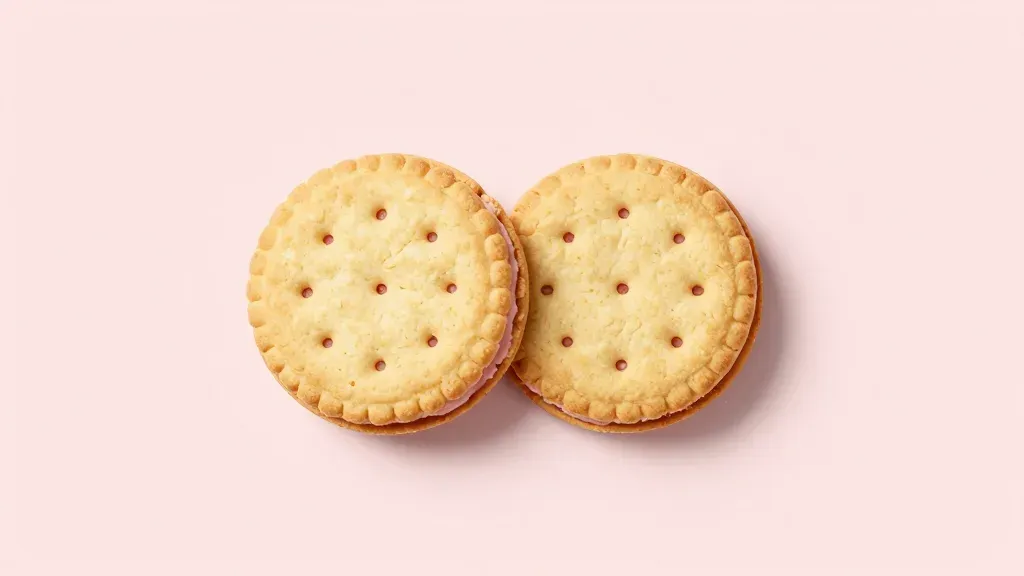 Golden, crumbly cookies sandwiched with a soft, creamy pink filling, softly lit to highlight texture and color, arranged in a balanced, inviting composition against a light pink background.