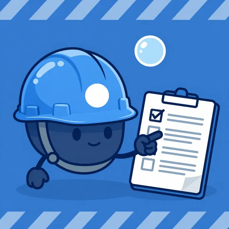 A construction worker in a blue hard hat and jumpsuit holds a clipboard, examining a checklist. The even, soft lighting highlights the reflective surfaces and creates a sense of clarity, with a blurred blue and white caution striped background emphasizing the subject.