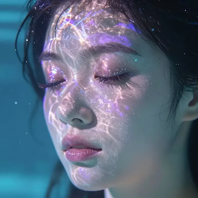 A person's face, eyes closed, with wet, glistening skin reflecting soft, diffused light from the water above, creating highlights and reflections. The close-up shot focuses on the face, with the water's ripples and reflections in the background creating a sense of depth and movement.