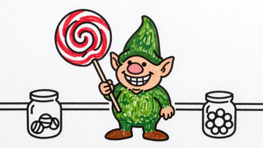 A cheerful cartoon gremlin with mossy green skin holds a large red and white swirled lollipop, standing between two glass jars filled with shiny round candies. The scene is lit with even, diffused overhead light creating soft highlights, set against a clean gray background with a horizontal counter line and shallow depth of field emphasizing the central subject.