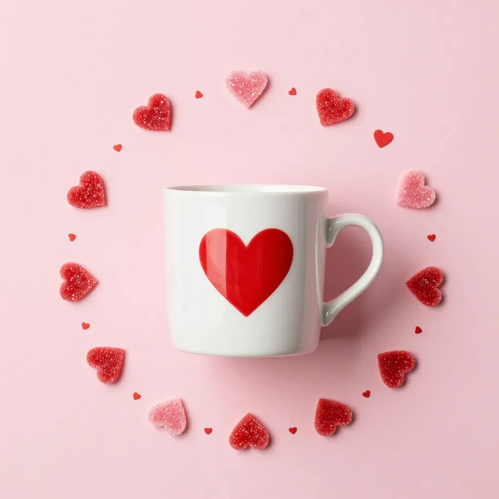 A glossy white ceramic mug featuring a vibrant red heart is centered on a soft pink surface, encircled by heart-shaped candies with sugary crystalline textures and subtle glitter. The soft, diffused overhead lighting creates gentle highlights and minimal shadows, with a shallow depth of field emphasizing the mug against a clean, uniform background.