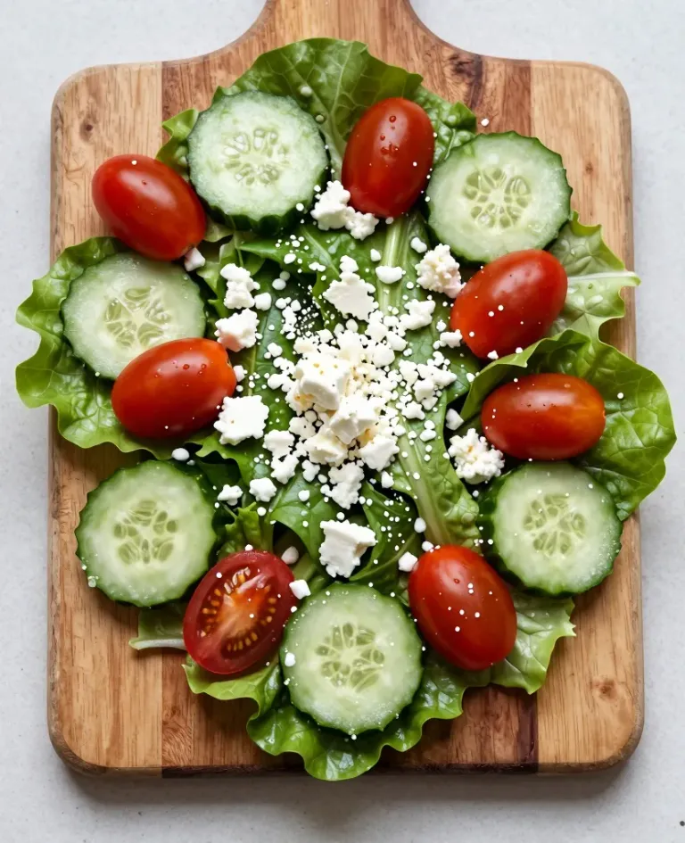 A vibrant garden salad featuring crisp lettuce, juicy cherry tomatoes, creamy feta cheese, and sliced cucumbers, arranged in a circular pattern on a wooden cutting board under soft, natural light. The neutral background ensures the focus remains on the fresh ingredients and their textures.