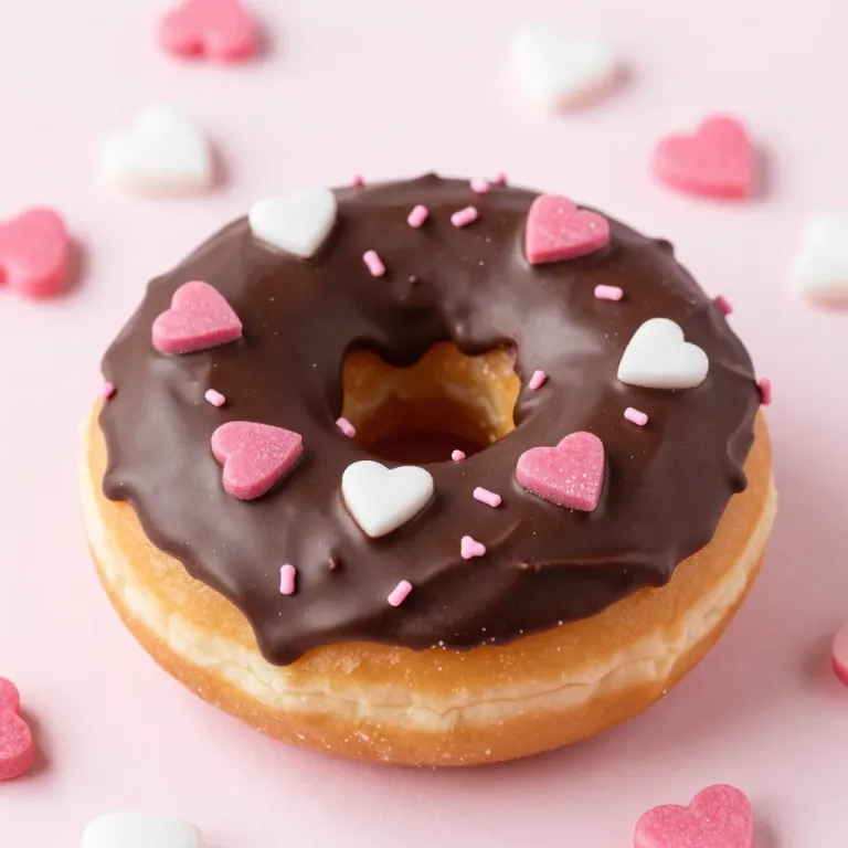 A close-up of a chocolate ganache-dipped donut adorned with heart-shaped sprinkles, illuminated by soft, diffused light that highlights its glossy texture and delicate sprinkles, creating a romantic and festive atmosphere with a shallow depth of field that slightly blurs the background hearts.