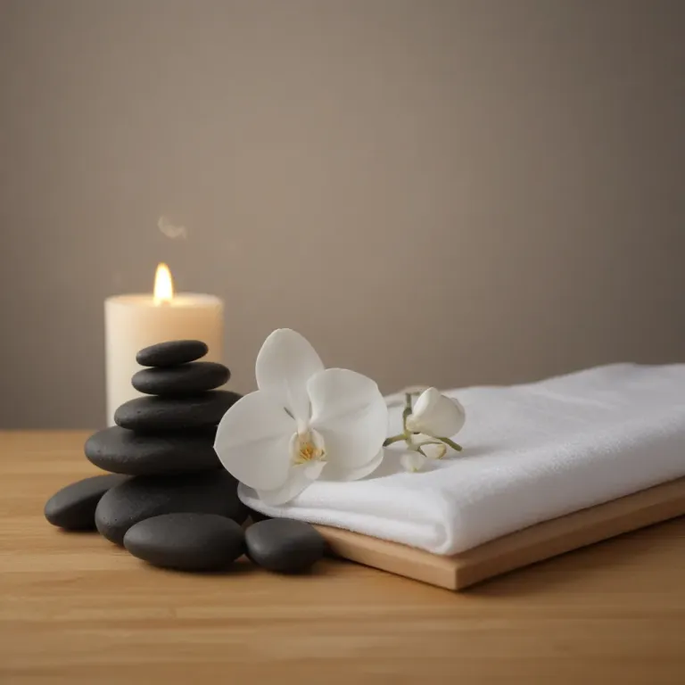 A serene arrangement of dark stones, a white orchid, and a lit candle on a white towel, creating a peaceful spa atmosphere. The soft, warm lighting highlights the textures and creates gentle shadows, emphasizing the harmony and balance of the composition.