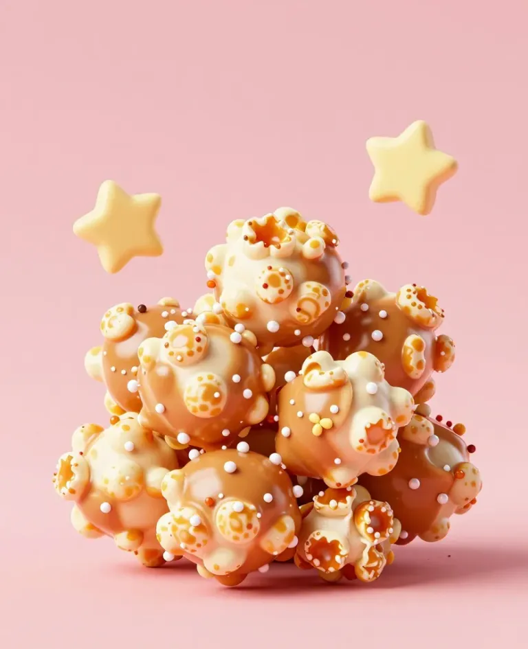 Glossy caramel-coated popcorn clusters adorned with white and gold sprinkles and pale yellow star decorations, presented in a close-up view that emphasizes their crunchy texture and sweet appeal. Soft front-top lighting creates gentle highlights on the caramel surfaces, while a shallow depth of field and solid pink backdrop provide clean, distraction-free composition with ample copy space.