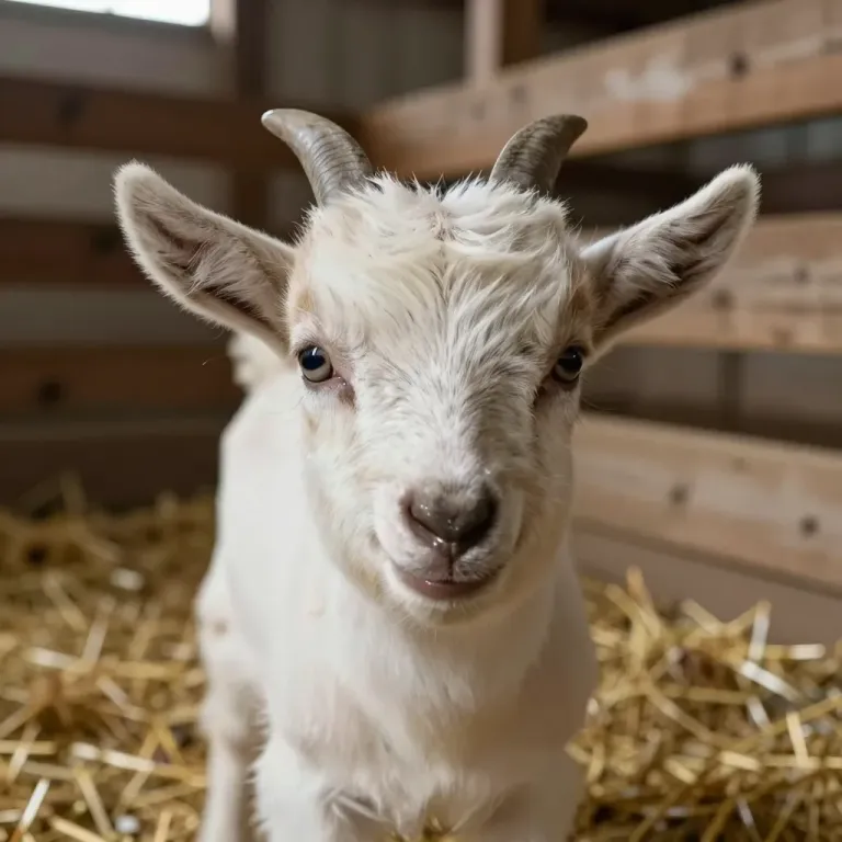 A young goat with glossy white fur and small, curved horns gently nudges forward, set against a backdrop of golden straw and wooden barn beams. The soft, natural lighting highlights the texture of the goat's fur and the golden straw, creating a serene and intimate portrait.