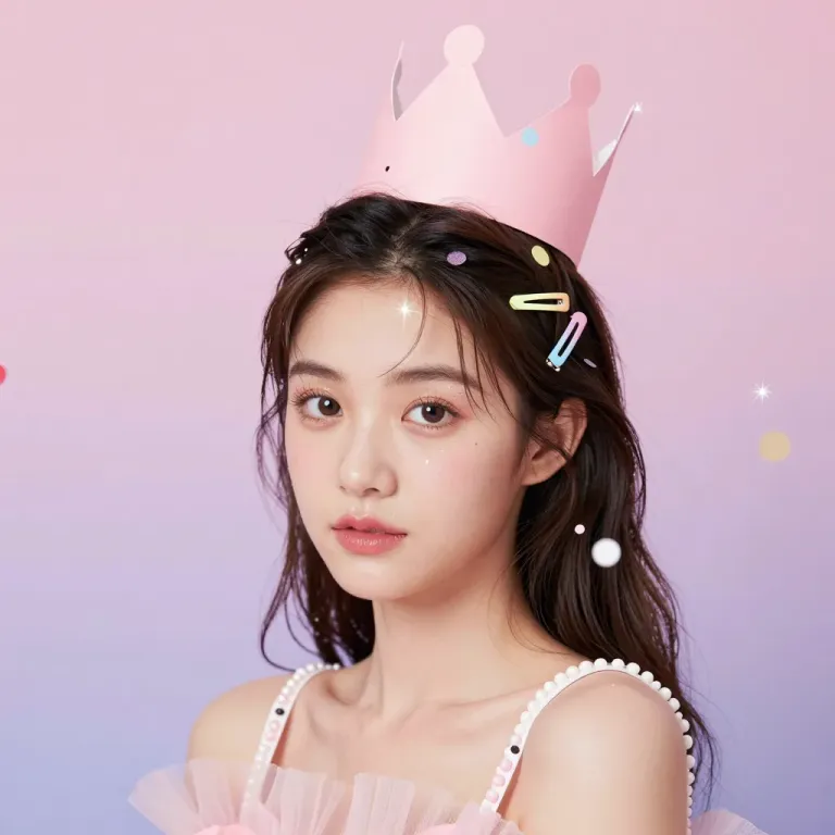 A young woman with dark, glossy hair adorned with colorful hair clips and a pearl-embellished dress stands against a soft, pastel pink background with subtle sparkles and a paper crown, creating a dreamy, celebratory atmosphere. The soft, diffused lighting highlights her features and the texture of her dress, while the shallow depth of field keeps the focus on her, making it ideal for fashion or lifestyle campaigns.