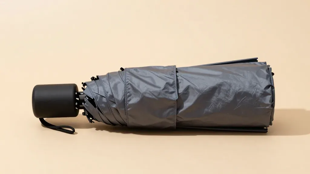 A compact umbrella, folded and lying flat with smooth, glossy gray fabric, slightly wrinkled, and a black handle, under soft, diffused light from above, creating gentle shadows. The shallow depth of field and smooth beige background emphasize the umbrella, offering ample copy space for design purposes.