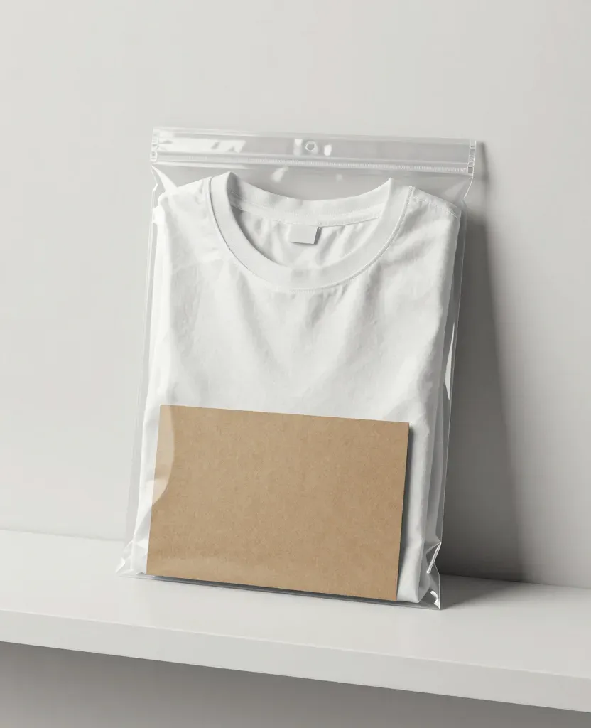 A neatly folded white T-shirt rests in a clear plastic bag, showcasing smooth fabric and glossy plastic textures under soft, diffused lighting. The clean white background and shallow depth of field emphasize the subject, making it ideal for product photography and packaging design.